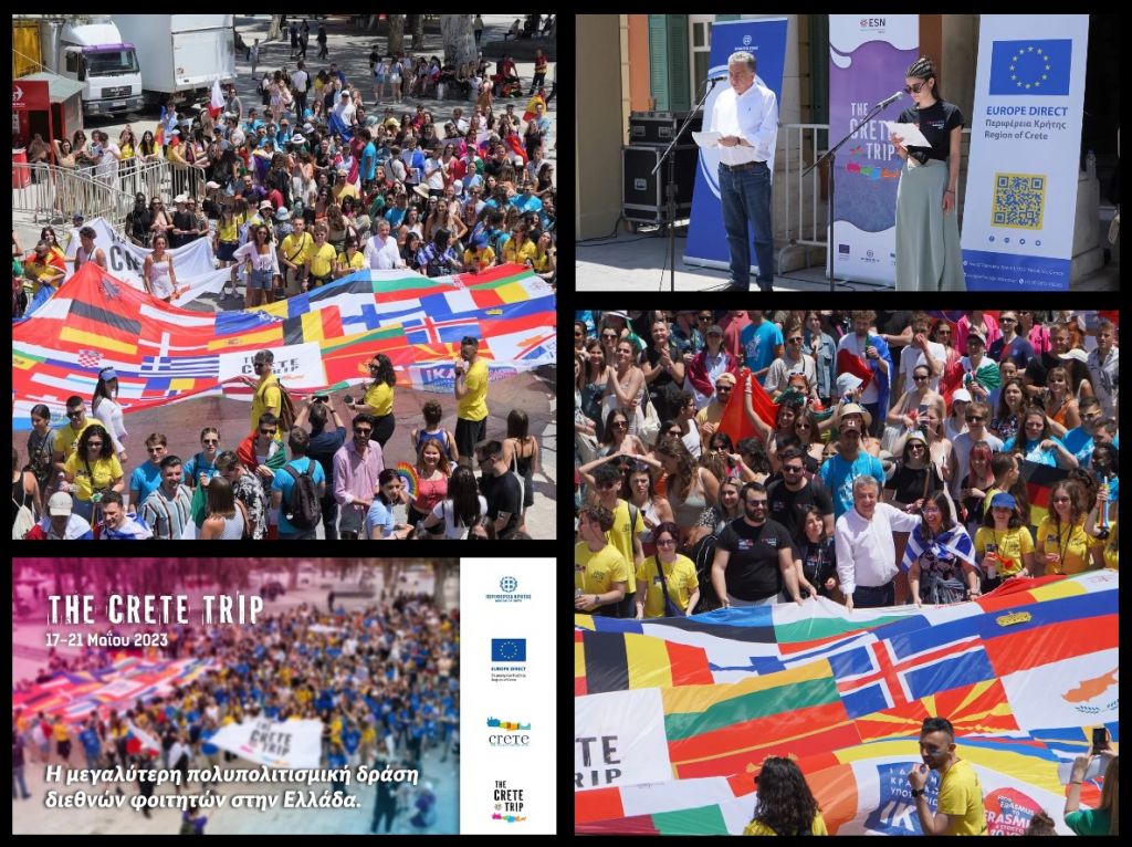 Μία από τις μεγαλύτερες διοργανώσεις για φοιτητές Erasmus+ σε ολόκληρη την Ευρώπη ήταν σε εξέλιξη στην Κρήτη και έως τις 21 Μαΐου 2023, υπό την αιγίδα του Υπουργείου Τουρισμού και με την έμπρακτη στήριξη της Περιφέρειας Κρήτης και του Europe Direct της Περιφέρειας Κρήτης . Με τη συμμετοχή περισσότερων των 900 διεθνών φοιτητών από 45 χώρες, το The Crete Trip 2023 θα προσέφερε και φέτος μια ισχυρή δυνατότητα εξωστρέφειας και προβολής για το νησί, όπως κάθε χρόνο.
