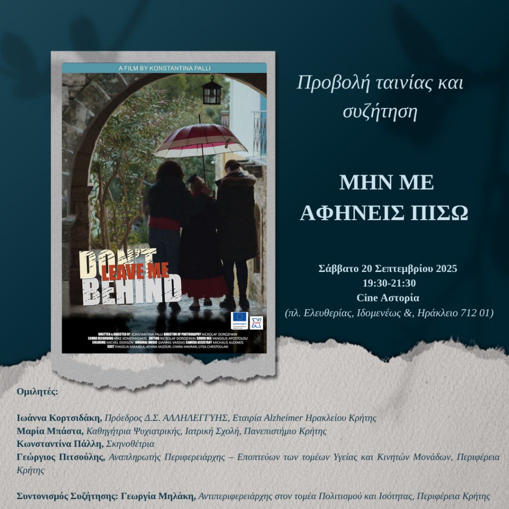 Με αφορμή την Παγκόσμια Ημέρα για τη νόσο Alzheimer (21 Σεπτεμβρίου 2025), το Europe Direct της Περιφέρειας Κρήτης και η εταιρία Studio Rosso συνδιοργανώνουν την πρεμιέρα της ταινίας μικρού μήκους της Κωνσταντίνας Πάλλη στον Κινηματογράφο Αστόρια με ελεύθερη είσοδο. Μετά την προβολή θα ακολουθήσει συζήτηση.