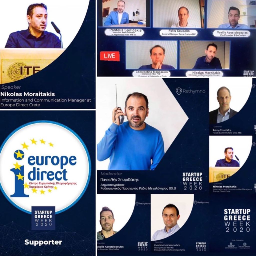 Το Κέντρο Ευρωπαϊκής Πληροφόρησης της Περιφέρειας Κρήτης – Europe Direct of Crete εκπροσωπήθηκε από το στέλεχος Νικόλα Μωραϊτάκης, ο οποίος συμμετείχε ως ομιλητής στο session του Ρεθύμνου την Κυριακή 10/05/2020 παρουσιάζοντας την πρωτοβουλία της Ευρωπαϊκής Επιτροπής – EU Startup Initiative για την ενδυνάμωση, προώθηση και αποτελεσματικότητα των Startups στην ΕΕ.
