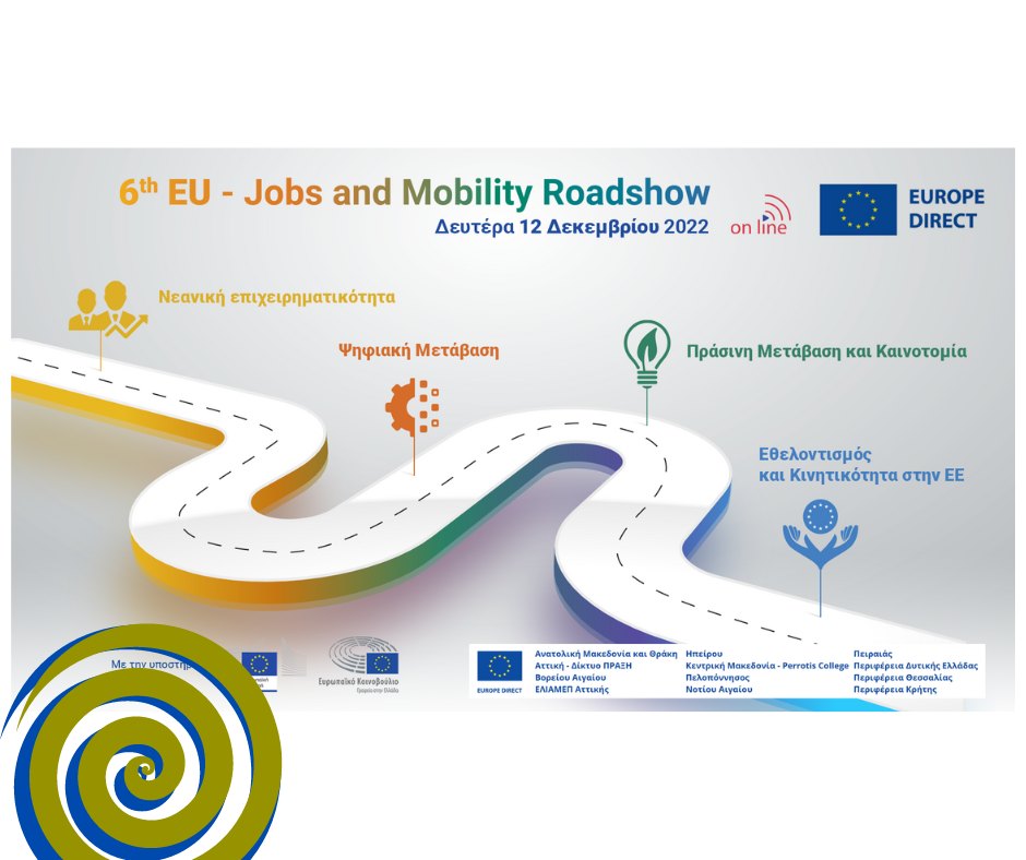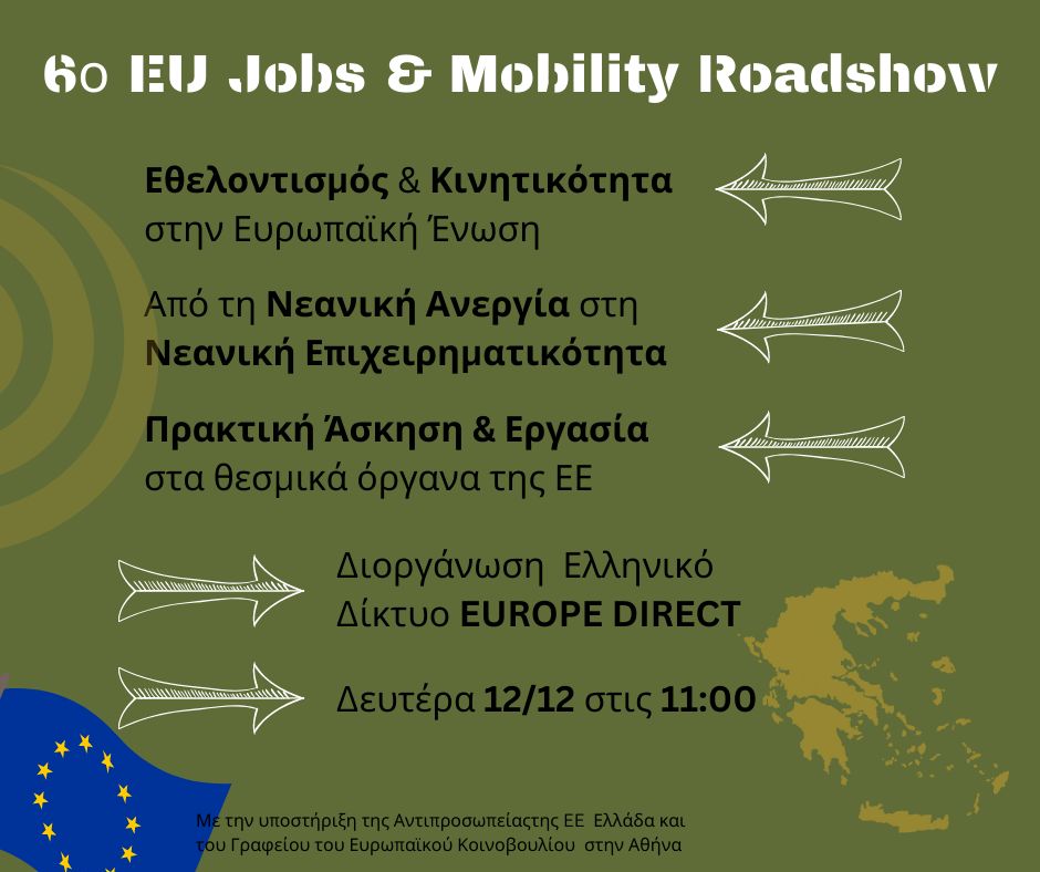 Το Ελληνικό Δίκτυο των EUROPE DIRECT, με την υποστήριξη της Αντιπροσωπείας της EE στην Ελλάδα και του Γραφείου του Ευρωπαϊκού Κοινοβουλίου στην Αθήνα, διεξήγαγε το 6ο EU Jobs and Mobility Roadshow την Δευτέρα 12 Δεκεμβρίου.