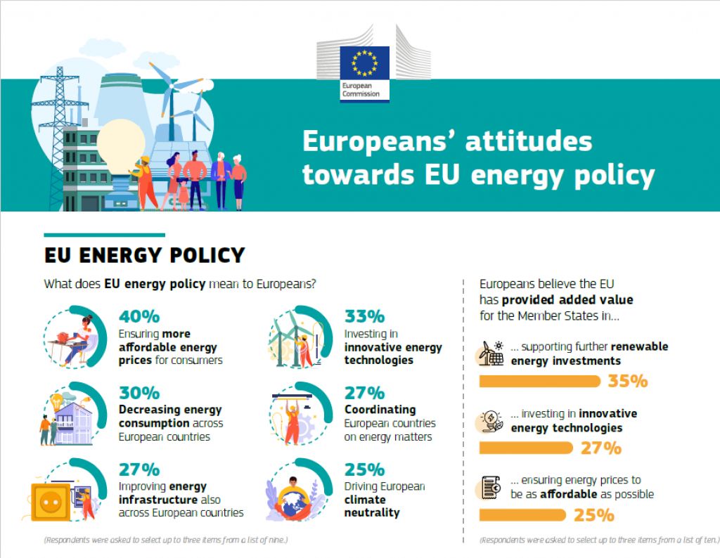 Το 79% όσων απάντησαν πιστεύει ότι οι στόχοι μας για το κλίμα θα δώσουν ώθηση στη δημιουργία θέσεων εργασίας και ότι θα προσελκύσουν επενδύσεις καθαρής ενέργειας. Το 76% πιστεύει ότι η πολιτική μας θα μειώσει την εξάρτηση από τις εισαγωγές ενέργειας και το 69% ότι θα μειώσει τους λογαριασμούς ενέργειας για τα νοικοκυριά και τις επιχειρήσεις. Όταν τους ζητήθηκε να αναφέρουν πολιτικές της ΕΕ της τελευταίας πενταετίας που είχαν προστιθέμενη αξία για τα κράτη μέλη, το 35% ανέφεραν τη στήριξη για επενδύσεις σε ανανεώσιμες πηγές ενέργειας, ενώ το 27% δήλωσε ότι η ΕΕ έχει προσδώσει προστιθέμενη αξία επενδύοντας σε καινοτόμες ενεργειακές τεχνολογίες. Επιπλέον, το 25% δήλωσε ότι η Ευρώπη έχει συμβάλει ώστε οι τιμές της ενέργειας να είναι όσο το δυνατόν πιο προσιτές, ενώ άλλοι ανέφεραν ότι η ΕΕ διεύρυνε τις επιλογές των καταναλωτών όσον αφορά τον ενεργειακό εφοδιασμό (24%) και τα προϊόντα χαμηλής κατανάλωσης ενέργειας (18%). Όταν ερωτήθηκαν ειδικότερα για το ευρωπαϊκό ενεργειακό σήμα, τα τρία τέταρτα των ερωτηθέντων (75%) δήλωσαν ότι επηρέασε την επιλογή τους για την αγορά συσκευής κατά την τελευταία πενταετία.