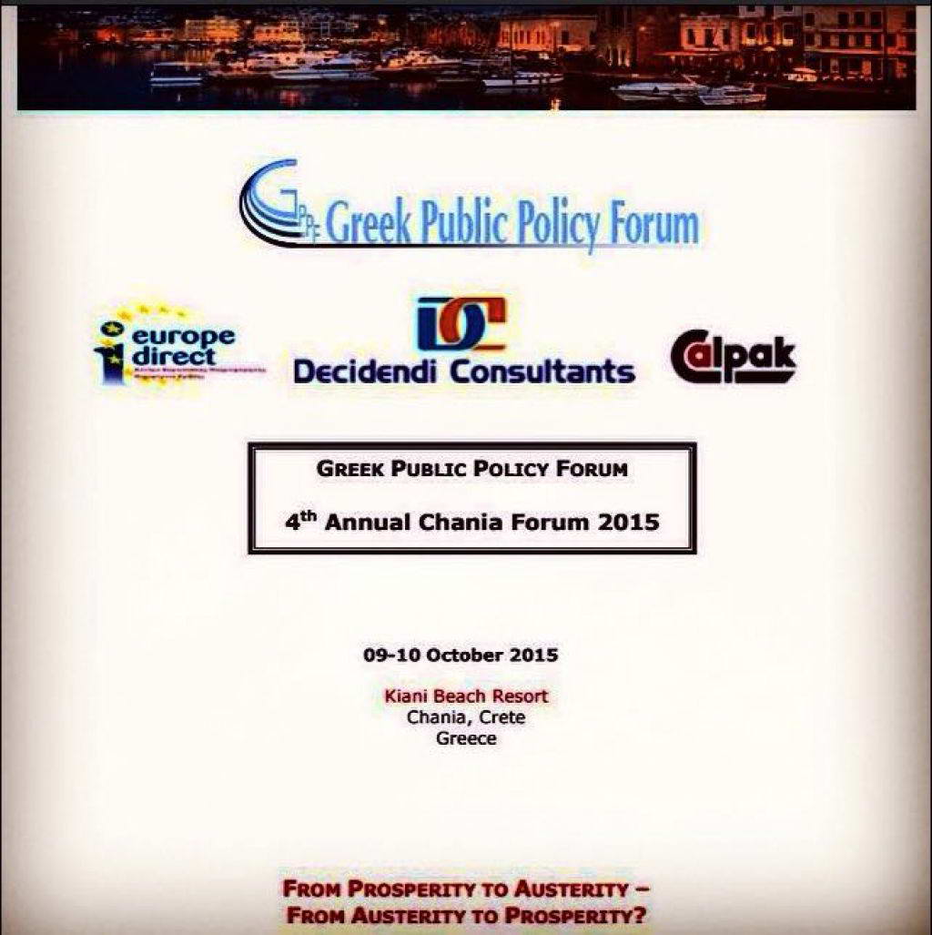 Το Europe Direct της Περιφέρειας Κρήτης στέκεται για άλλη μία φορά αρωγός στη διοργάνωση του Greek Public Policy Forum - Ελληνικό Φόρουμ Δημόσιας Πολιτικής, που θα πραγματοποιηθεί στις 09-10 Οκτωβρίου 2015 στο Kiani Beach Resort στις Καλύβες Χανίων με τίτλο: «Από την Ευημερία στη Λιτότητα - Από τη Λιτότητα στην Ευημερία;