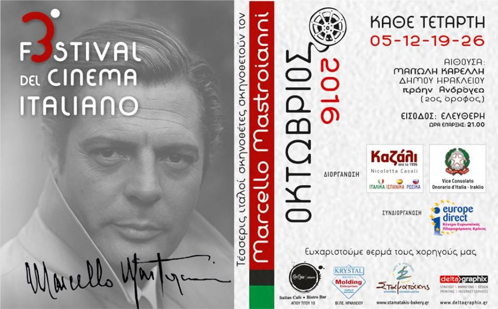 Στα πλαίσια αυτού θα πραγματοποιηθεί αφιέρωμα στον Ιταλικό Κινηματογράφο με την προβολή Ιταλικών ταινιών κάθε Τετάρτη για όλο τον μήνα Οκτώβριο στην Αίθουσα Μανώλη Καρέλλη (πρώην Ανδρόγεω) του Δήμου Ηρακλείου.