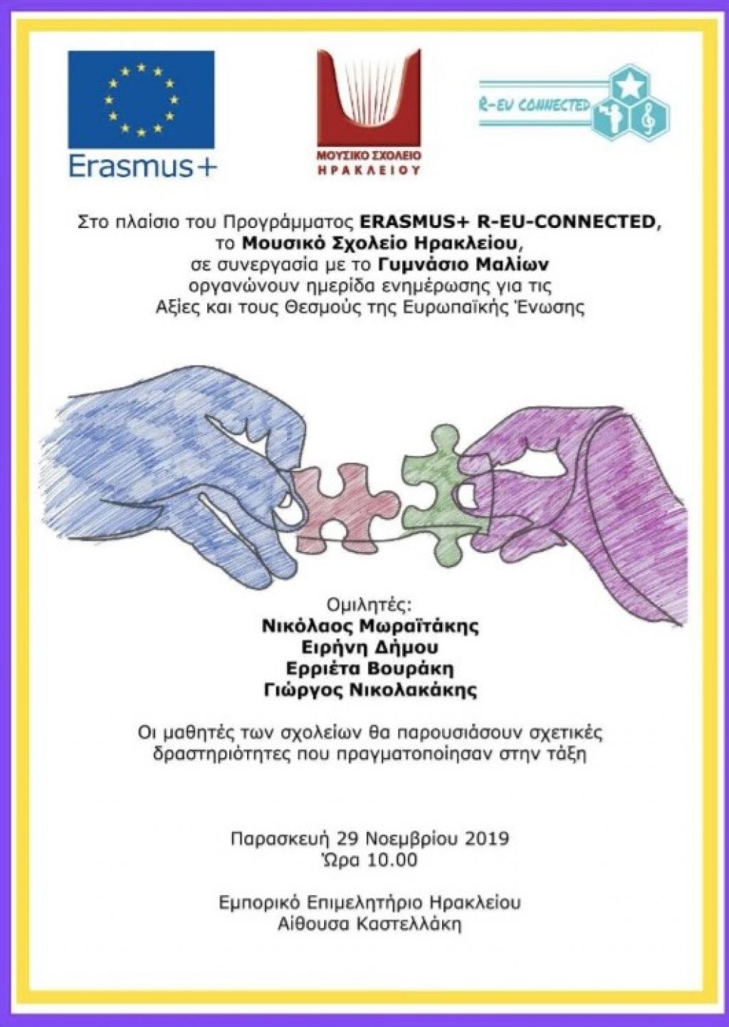 Το Europe Direct Crete θα συμμετέχει στην ημερίδα ενημέρωσης για τις “Αξίες και τους Θεσμούς της Ευρωπαϊκής Ένωση” στο πλαίσιο του Προγράμματος Erasmus+ R-EU-CONNECTED που θα διοργανώσουν το Μουσικό Σχολείο Ηρακλείου σε συνεργασία με το Γυμνάσιο Μαλίων.