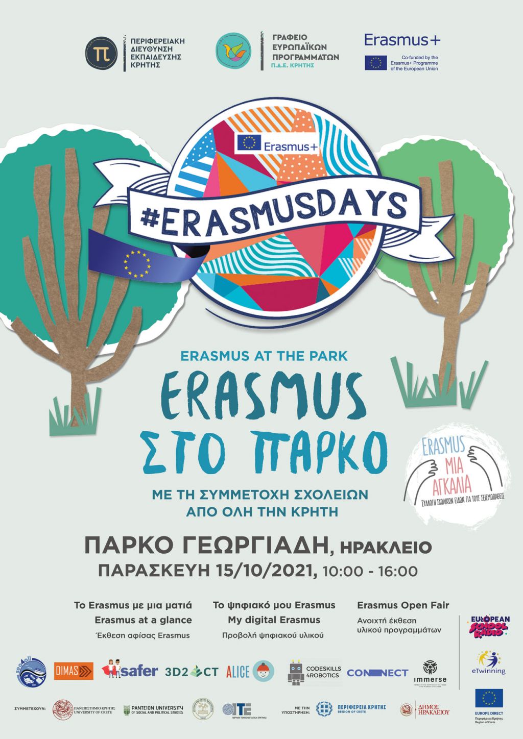 Σας περιμένουμε την Παρασκευή 15/10/2021 από τις 10:00 έως τις 16:00 στο πάρκο Γεωργιάδη στο Ηράκλειο, για να ανακαλύψουμε παρέα ενδιαφέροντα Erasmus που υλοποιούν σχολεία και εκπαιδευτικοί φορείς απ' όλη την Κρήτη, αλλά και για να σας παρουσιάσουμε τα αποτελέσματα ιδιαίτερα σημαντικών ευρωπαϊκών προγραμμάτων που έχει υλοποιήσει η ΠΔΕ Κρήτης.