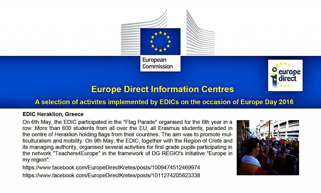 Οι δράσεις του Europe Direct της Περιφέρειας Κρήτης στη συλλογή των εκδηλώσεων της Ευρωπαϊκής Επιτροπής με αφορμή τον εορτασμό της “Ημέρας της Ευρώπης 2016”