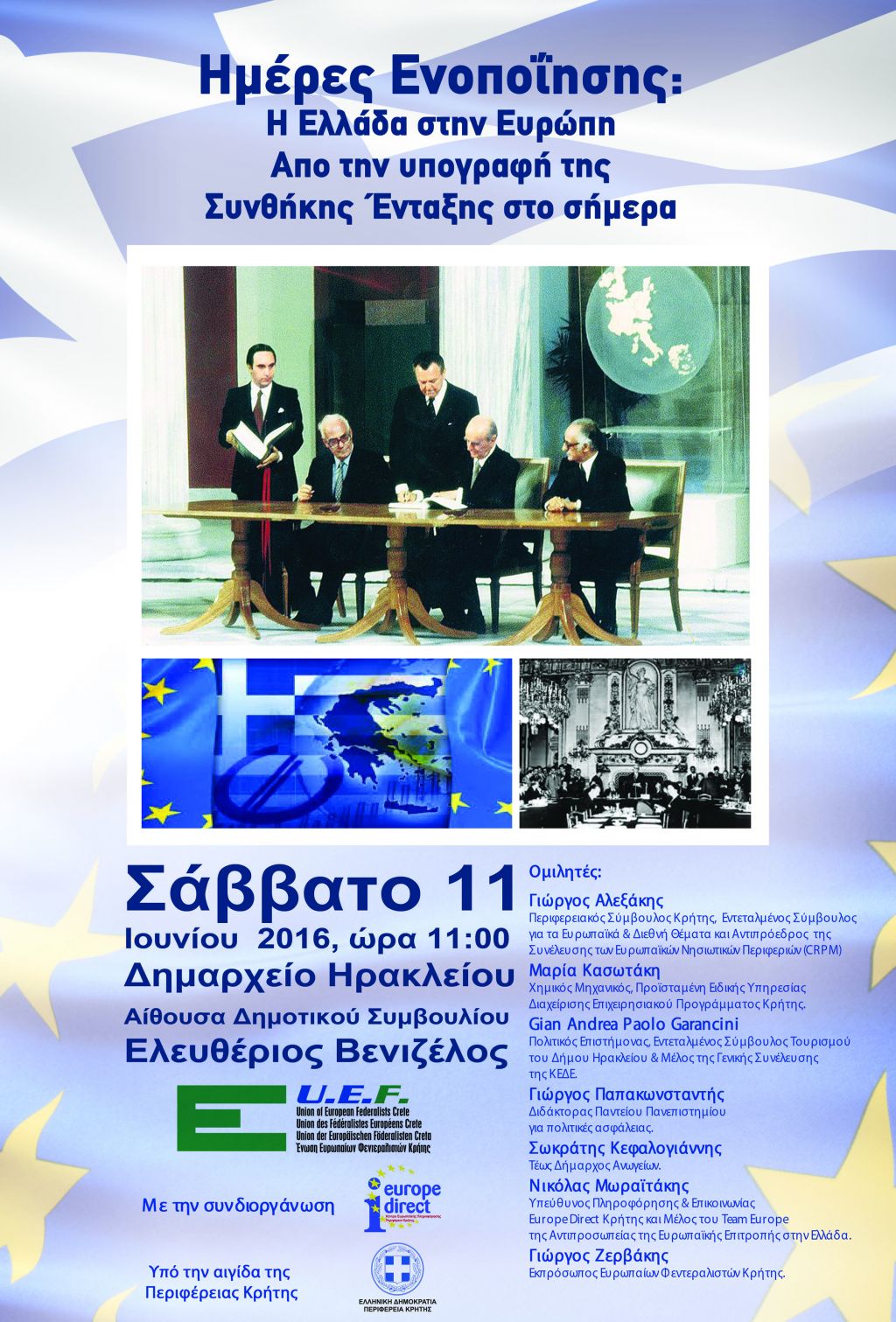 Οι Ευρωπαίοι Φεντεραλιστές Κρήτης με την συνδιοργάνωση του Κέντρου Ευρωπαϊκής Πληροφόρησης Europe Direct Κρήτης, την υποστήριξη της Περιφέρειας Κρήτης, πραγματοποιούν δημόσια συζήτηση το Σάββατο 11η Ιουνίου 2016, ώρα 11 : 00, στην αίθουσα Δημοτικού Συμβουλίου του Δήμου Ηρακλείου, με θέμα ‘’ Ημέρες ενοποίησης : Η Ελλάδα στην Ευρώπη - Από την υπογραφή της Συνθήκης ένταξης στο σήμερα ‘’ .