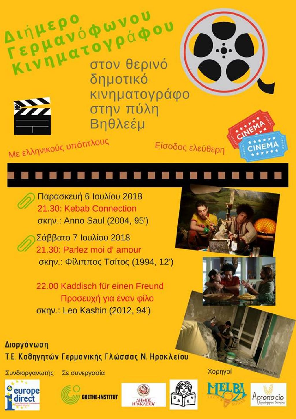 Η Τοπική Επιτροπή Ηρακλείου της Πανελλήνιας Ένωσης Καθηγητών Γερμανικής Γλώσσας Π.Ε. σε συνεργασία με το Europe Direct της Περιφέρειας Κρήτης, το Ινστιτούτο Goethe Αθηνών και τον Σύλλογο Γερμανόφωνων Γονέων και Κηδεμόνων Ηρακλείου διοργανώνουν για ένατη συνεχόμενη χρονιά ένα αφιέρωμα στον Γερμανόφωνο Κινηματογράφο.