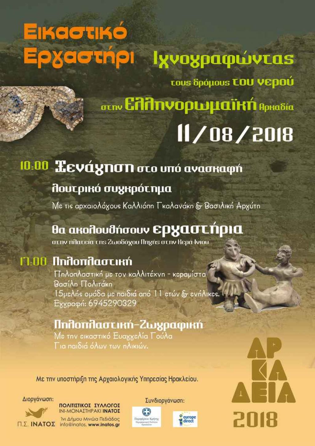 - Με αφορμή το Ευρωπαϊκό Έτος Πολιτιστικής Κληρονομιάς 2018 το Europe Direct της Περιφέρειας Κρήτης συνδιοργανώνει με τον πολιτιστικό σύλλογο Ίνι Μοναστηράκι (Ίνατος) “Εικαστικό εργαστήρι” με τίτλο: «Ixνογραφώντας τους δρόμους του νερούστην ελληνορωμαϊκή Αρκαδεία».